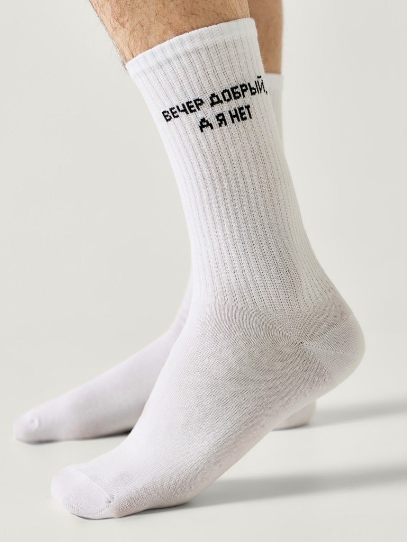 Șosete DIWARI ACTIVE 219 - inscripție ironică „BUNĂ SEARA, ȘI NU SUNT” pentru a stabili starea de spirit. Practicitate și umor într-o singură pereche. Tehnologie fără cusături Impregnare antibacteriană Culoare: alb - alegerea universală Ideal pentru stilul informal.