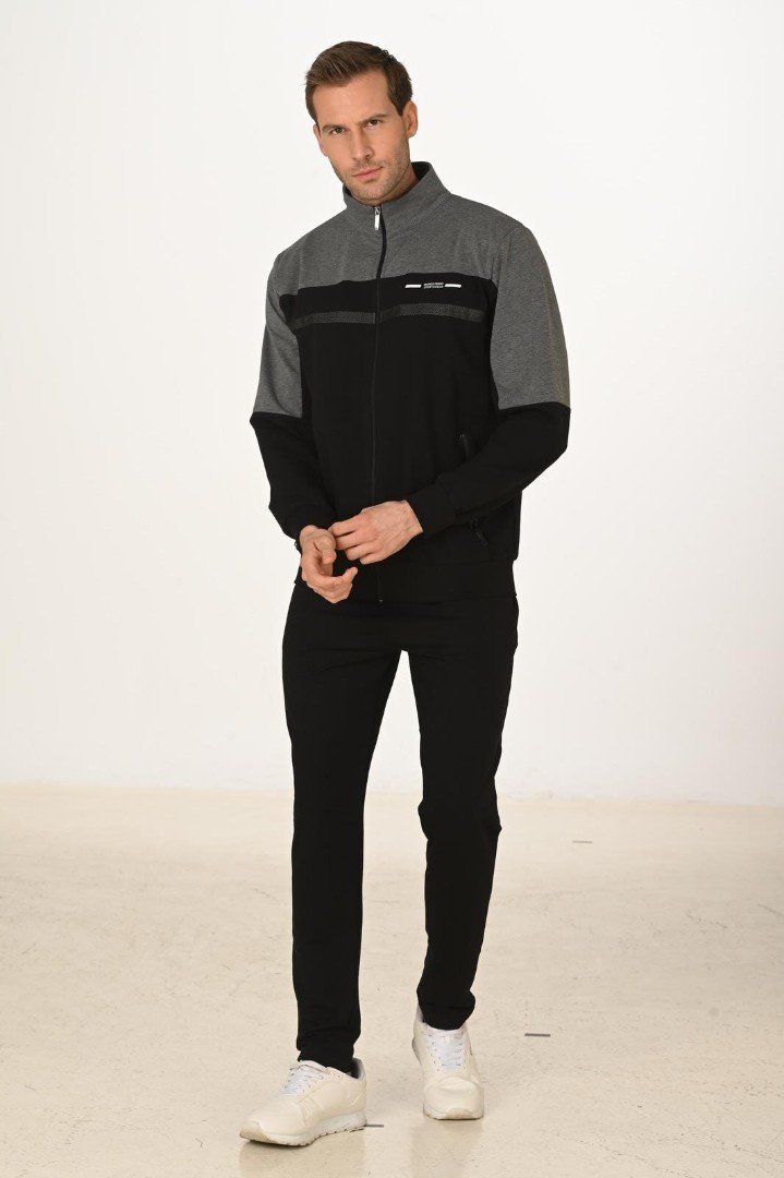 Costum sport pentru bărbați. Nu se decolorează și nu lasă urme pe genunchi. Are 4 buzunare cu fermoar. Detaliu sub formă de bandă pe piept. Croială dreaptă. Asigură confortul și mobilitatea datorită țesăturii din lycra.
