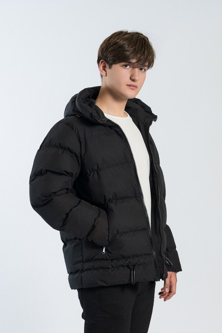 Jachetă de bărbați cu fermoar, glugă și buzunare cu fermoar. Gluga și tivul sunt ajustabile pentru a preveni pătrunderea vântului. Toamnă-Iarnă.