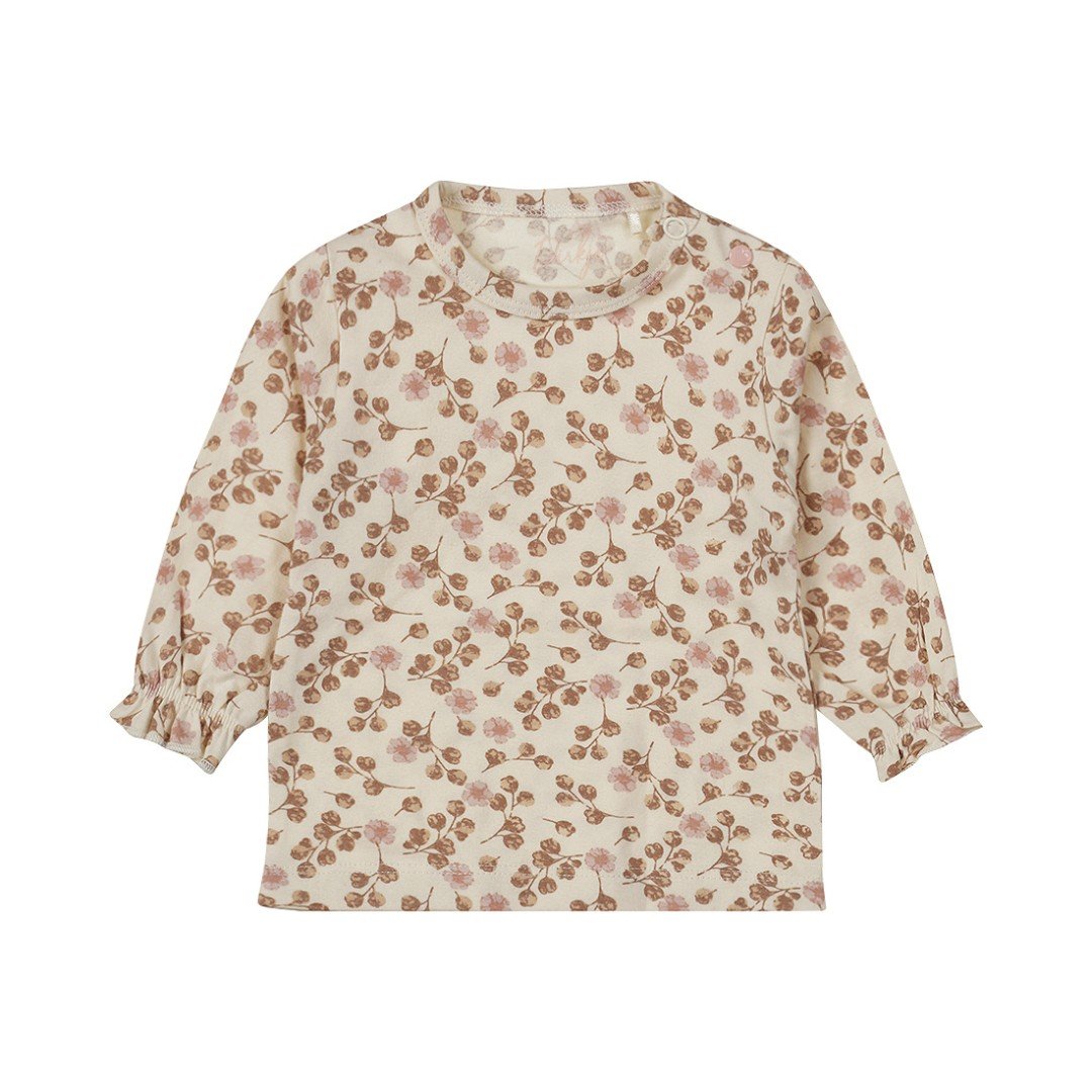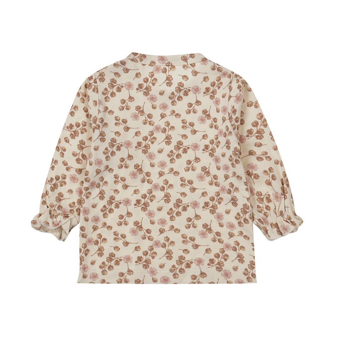 Tricoul cu mânecă lungă pentru fete este de culoare alb-gălbui și are un imprimeu frumos cu floricioare drăguțe în nuanțe de maro și roz. Tricoul ecru are o bandă elastică la mâneci și capse pe umăr. Hainele pentru bebeluși din bumbac organic sunt alegerea ideală pentru părinții care își doresc ce e mai bun pentru bebelușii lor. Fabricate din bumbac cultivat organic, aceste haine sunt moi, confortabile și sigure pentru pielea sensibilă a bebelușilor.