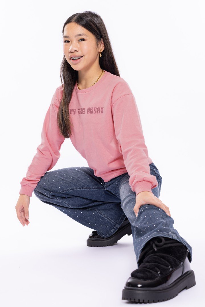 Puloverul este foarte atrăgător, cu textul motivațional de pe partea din față. Acest pulover pentru fete este disponibil într-o culoare roz pal și este confecționat din bumbac cu o doză fină de elasticitate. Puloverul nu este doar drăguț, ci și confortabil. Combinați puloverul cu blugi drăguți sau o fustă.