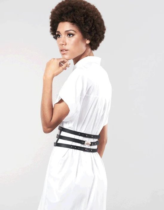 Centura larga - un accesoriu de moda, pe care o puteti purta peste o camasa sau o rochie alba. Daca detasati fasia centrala, treceti-o prin inelul din fata si veti capata un accesoriu nou - catuse.
