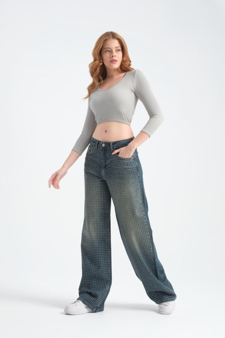 Blugi pentru femei Baggi cu talie medie. Partea din față este decorată cu pietre prețioase.