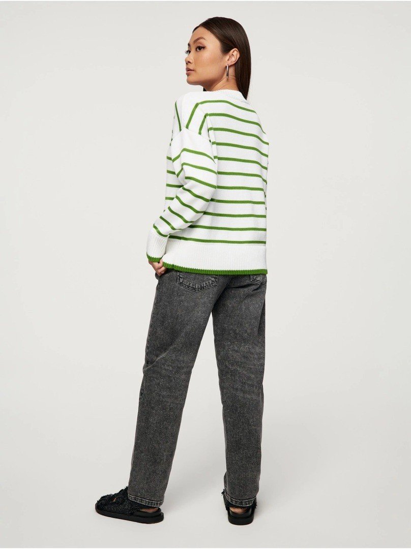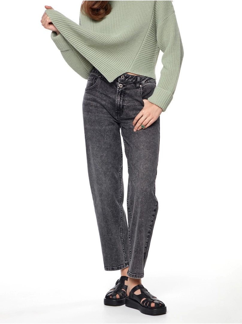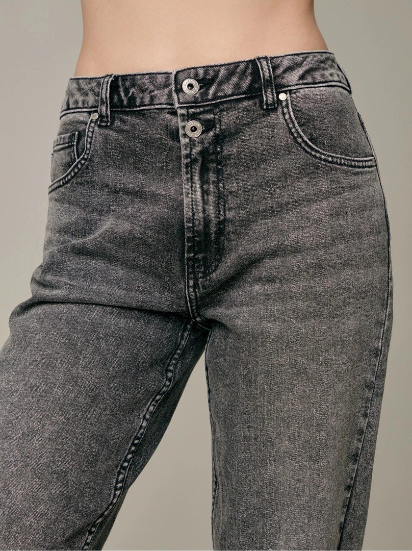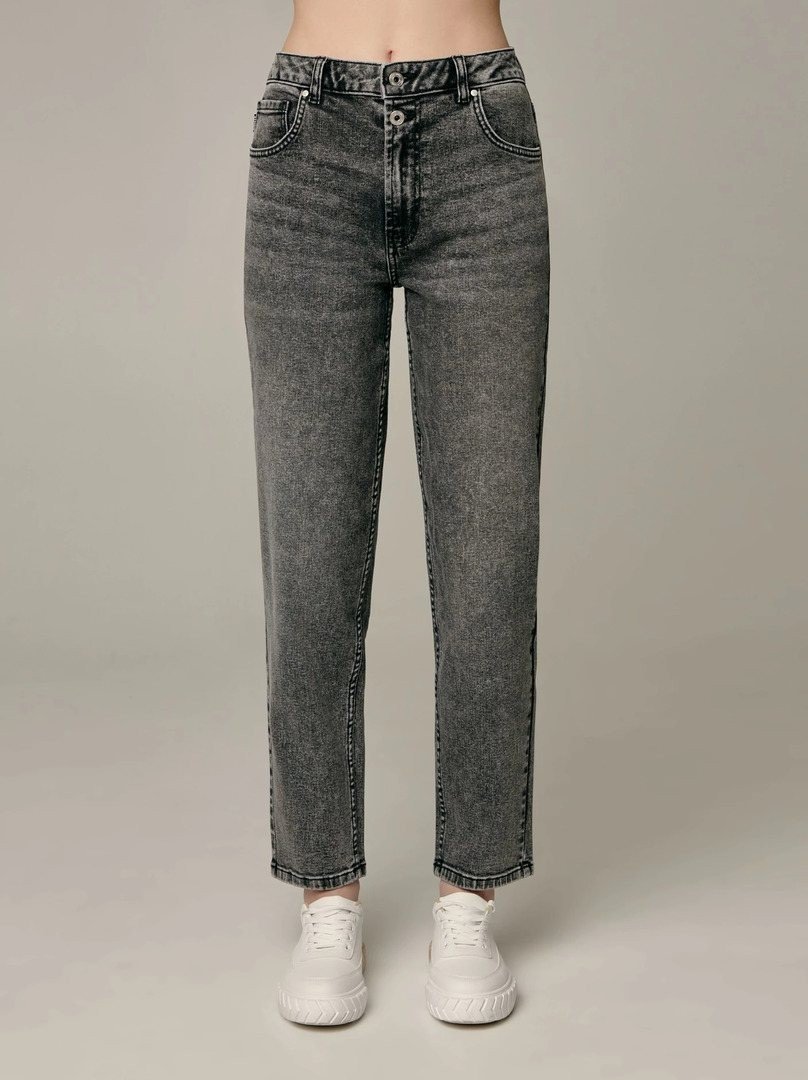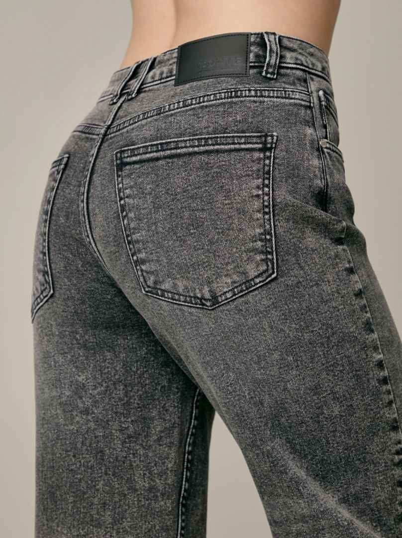 Blugii mom cu talie înaltă sunt potriviți fetelor cu diferite tipuri de silueta: datorită taliei înalte, potrivirii strânse la șolduri și picioarelor ușor conice, modelul modelează vizual silueta.