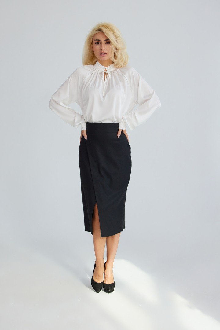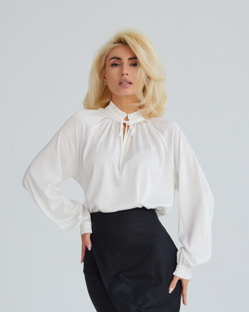 Bluza de dama cu croiala dreapta si maneci lungi. siret decorativa la gat.