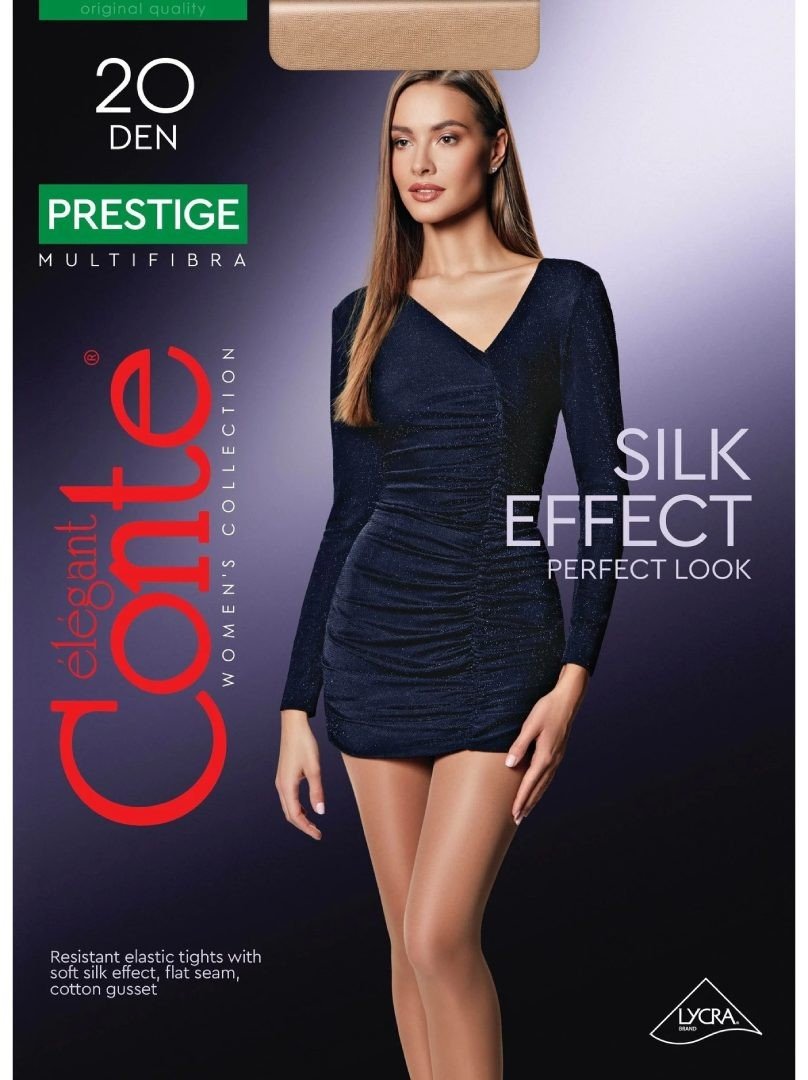 Dresurile elastice subtiri PRESTIGE cu un efect de matase delicat creeaza o senzatie speciala de moale. Dresurile sunt tricotate din fire multifilament, datorita structurii careia tesatura este ultra-puternica, neteda, cu o usoara stralucire lucioasa.
