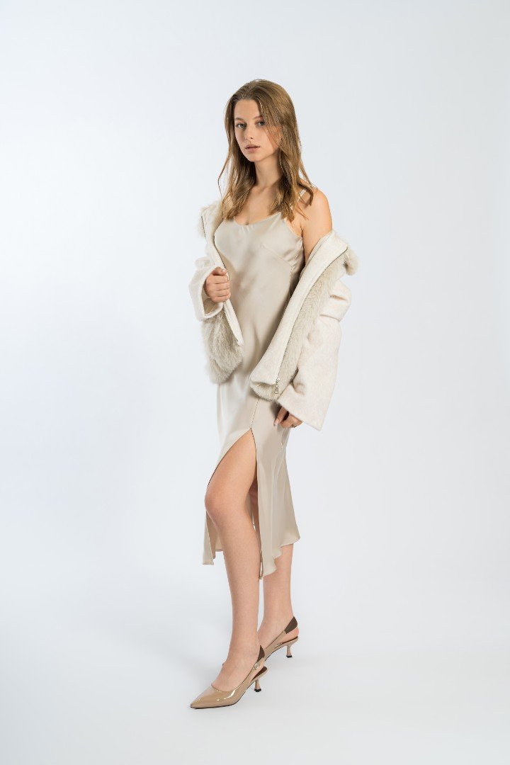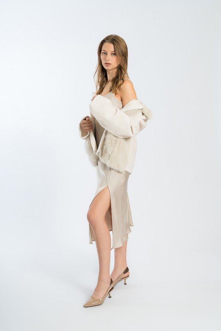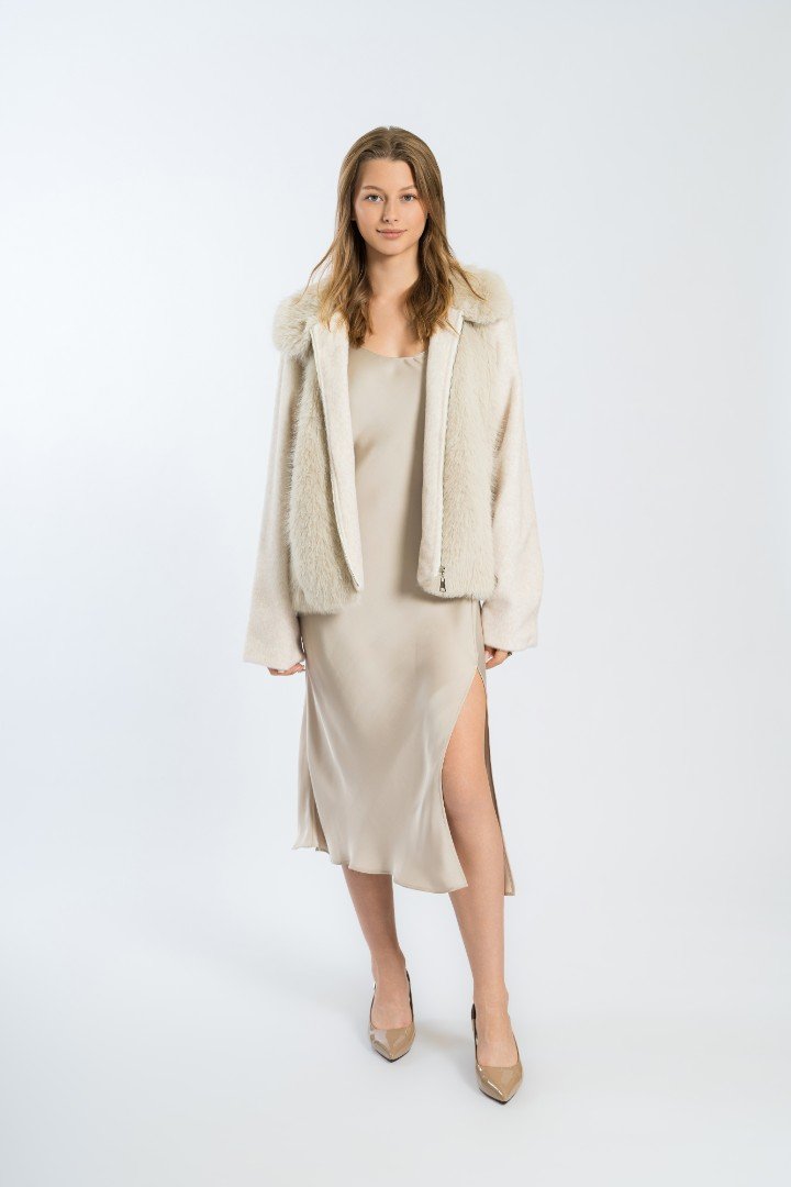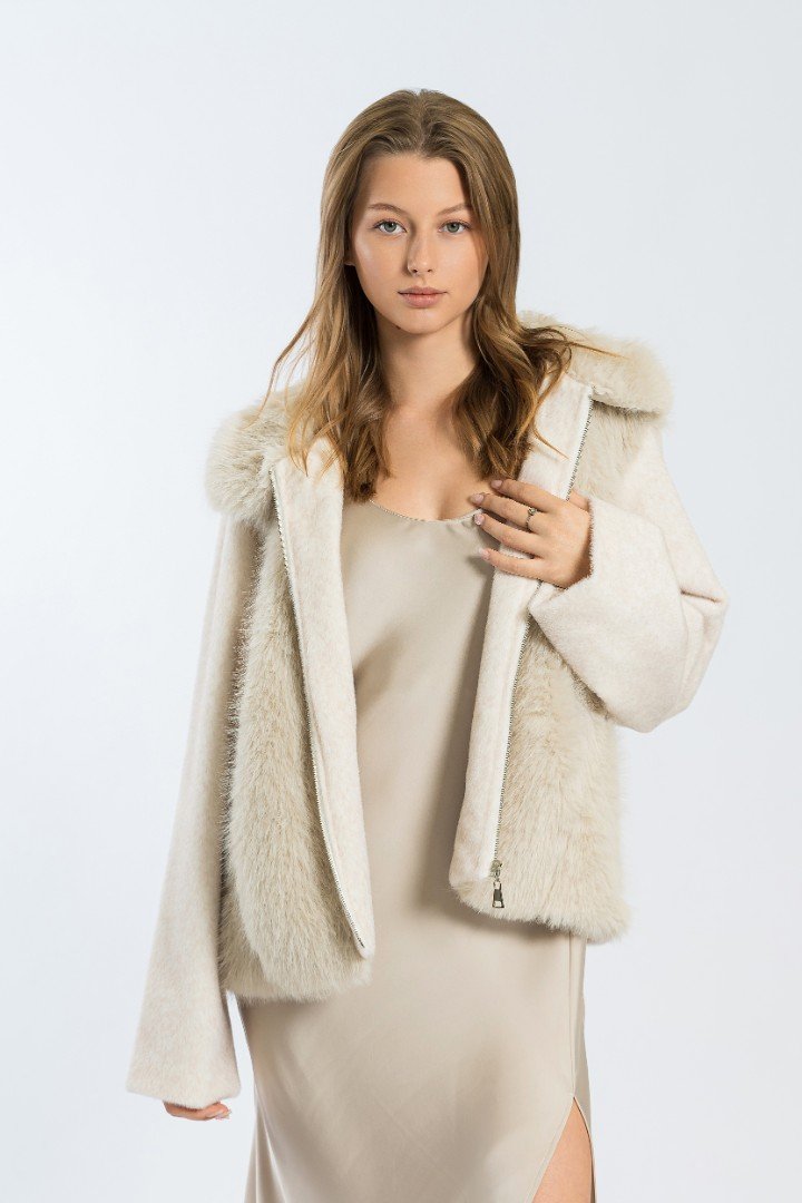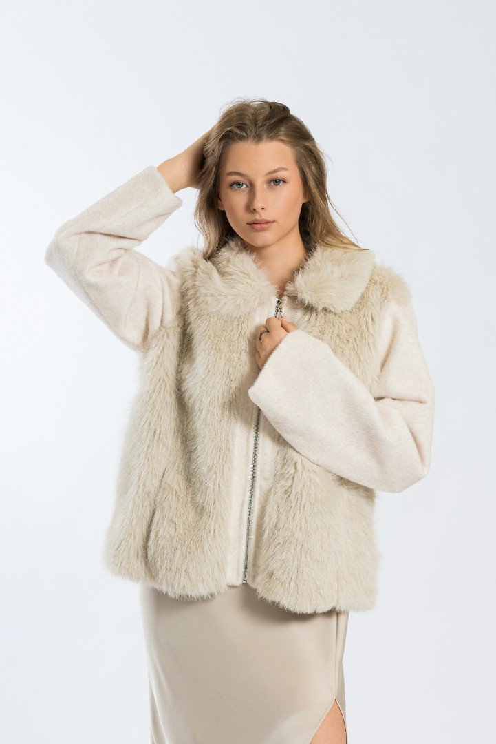 Jacheta pentru femei cu guler din blană de culoare ecru.