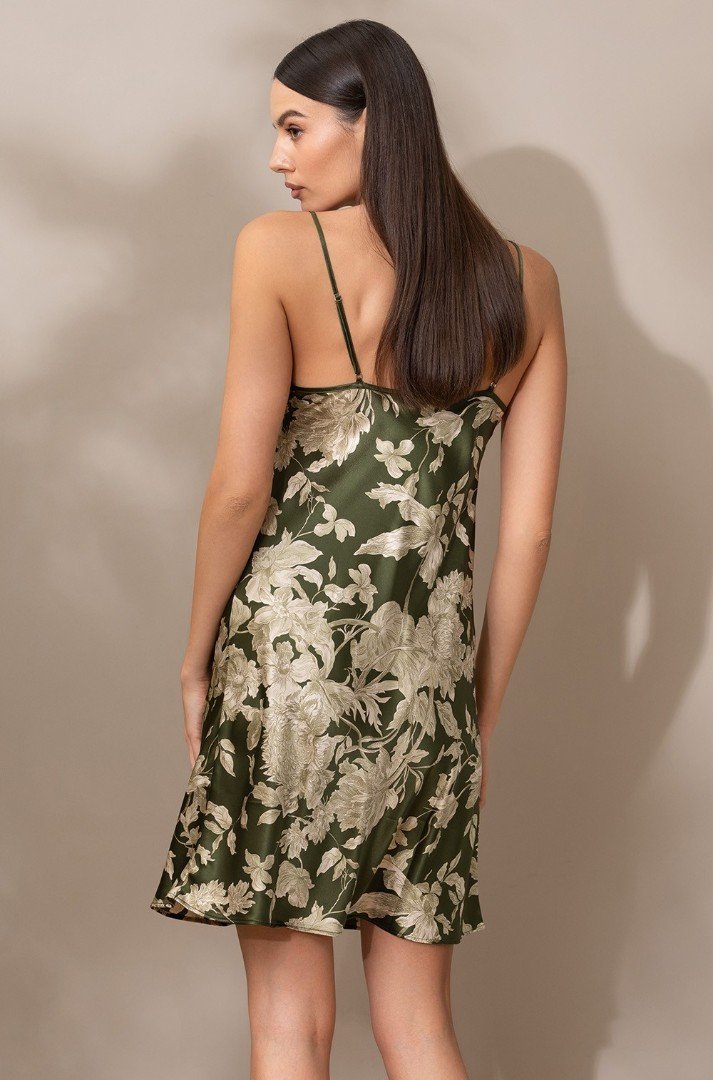 Cămașă scurtă cu bretele subțiri și fără tăietură sub sâni, realizată din mătase amestecată imprimată cu ornamente monocrome. Decor - fundiță mică din satin cu pandantiv în centrul decolteului cămășii.