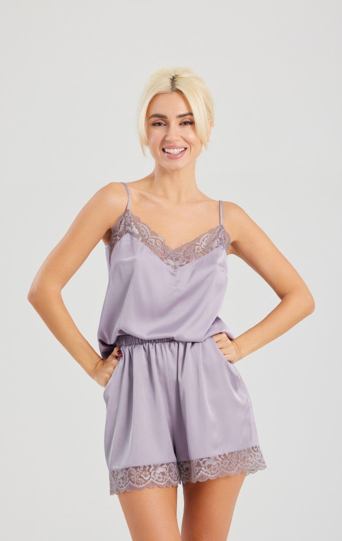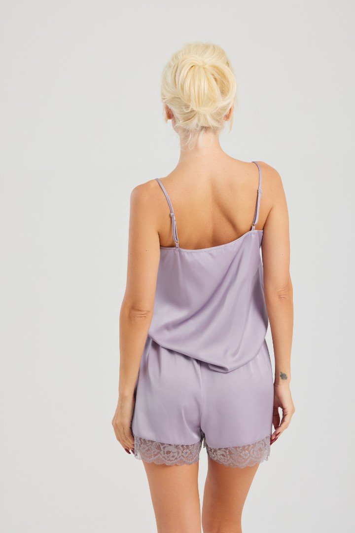 Pijama pentru femei formata dintr-un top si pantaloni scurti cu talie elastica. Decolteul si partea de jos a pantalonilor scurti sunt decorate cu dantela.