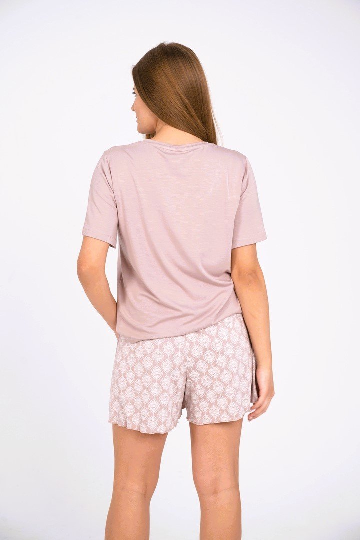 Pijama compusa din tricou si sorti. Tricou cu maneci scurti. sorti cu elastic in talie si buzunare saterale. Acest set este confectionat din tesatura foarte moale, placuta pentru piele.