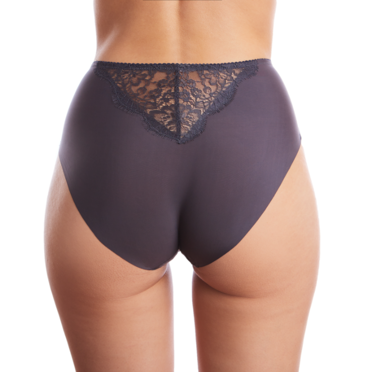 Culotele cu talie înaltă sunt un model de chiloți practic și foarte confortabil pentru purtarea zilnică. Se deosebesc de slipurile clasice prin decupajul mai jos al șoldului și prin detaliul din spate, care acoperă complet fesele. Acest model asigură invizibilitatea contururilor lenjeriei sub haine, astfel încât culotele pot fi combinate cu siguranță cu pantaloni subțiri sau fuste. Talie largă până la mijlocul taliei nu numai că asigură o potrivire sigură, dar creează și un efect ușor de corectare și subțiază vizual. Modelul este realizat din țesătură free-cut fără prelucrarea marginilor inferioare și este decorat cu o inserție din dantelă cu un model floral delicat.