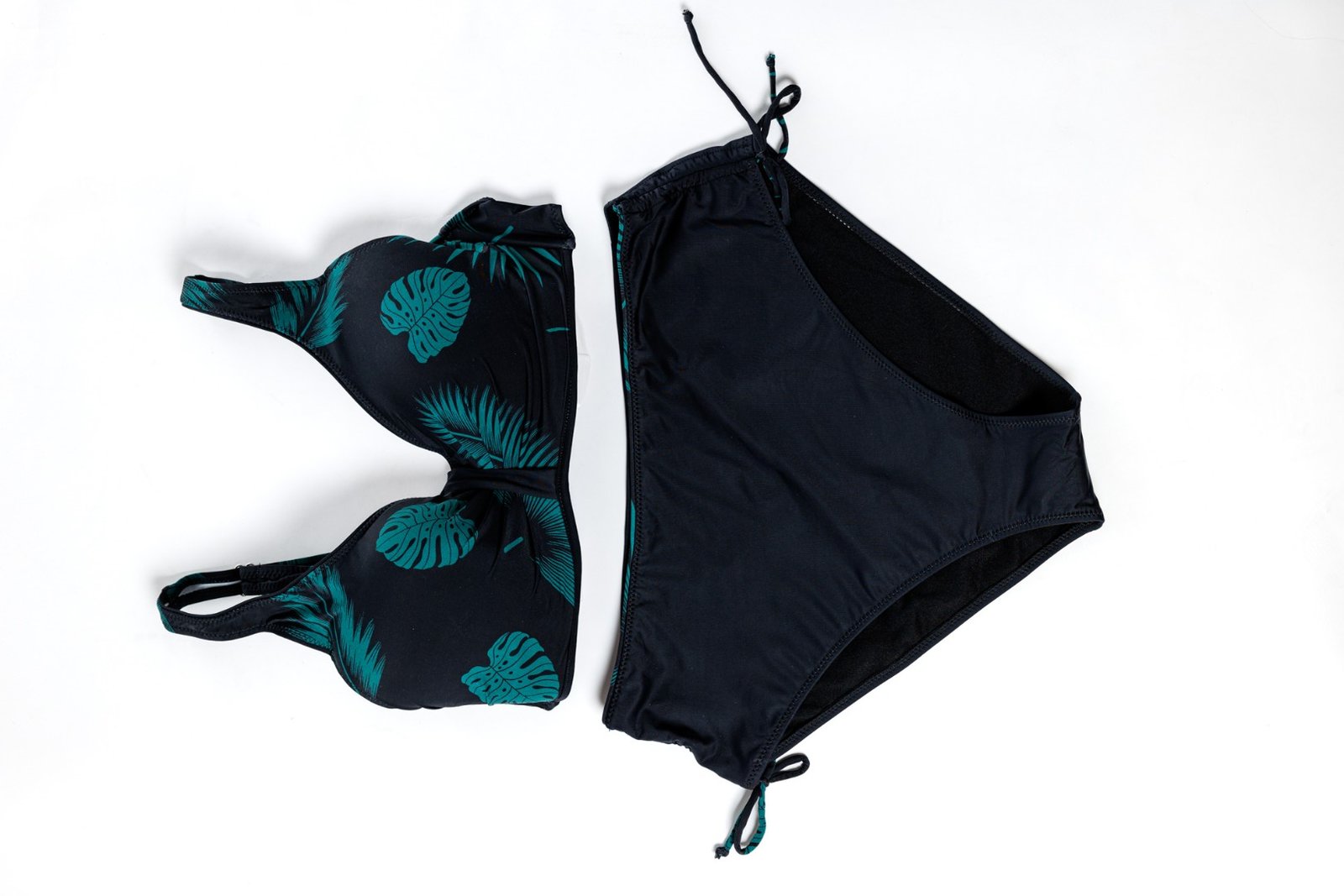 Costum de baie separat cu cupe din porolon subtire, cu bretele largi reglabile. Chiloți cu talie înaltă. Legăturile de pe părțile laterale ale costumului de baie permit ajustarea individuală a deschiderii costumului de baie.