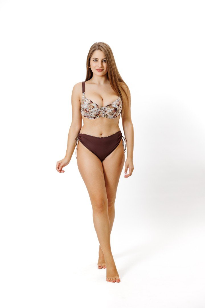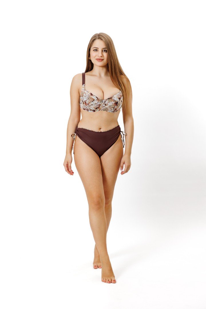 Costum de baie separat cu cupe moi, cu bretele late. Chiloți slip cu talie înaltă. Legaturi pe părțile laterale ale costumului de baie permit ajustarea individuală a deschiderii produsului.