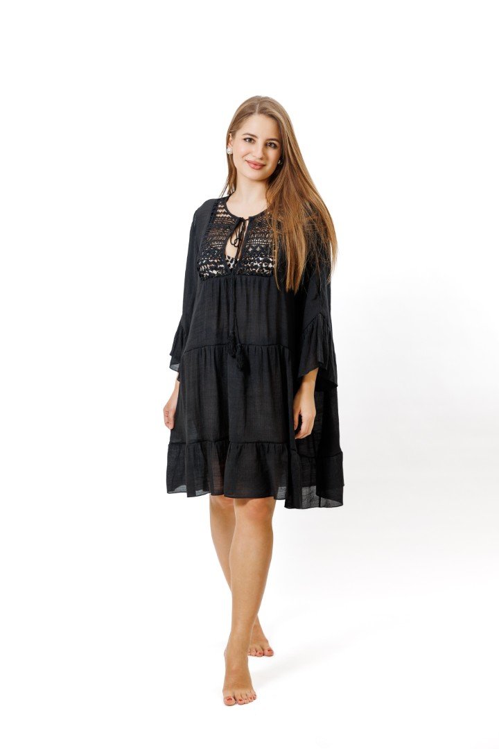 Rochie tunică de plajă. Ținută lejeră. Decorată cu dantelă.
