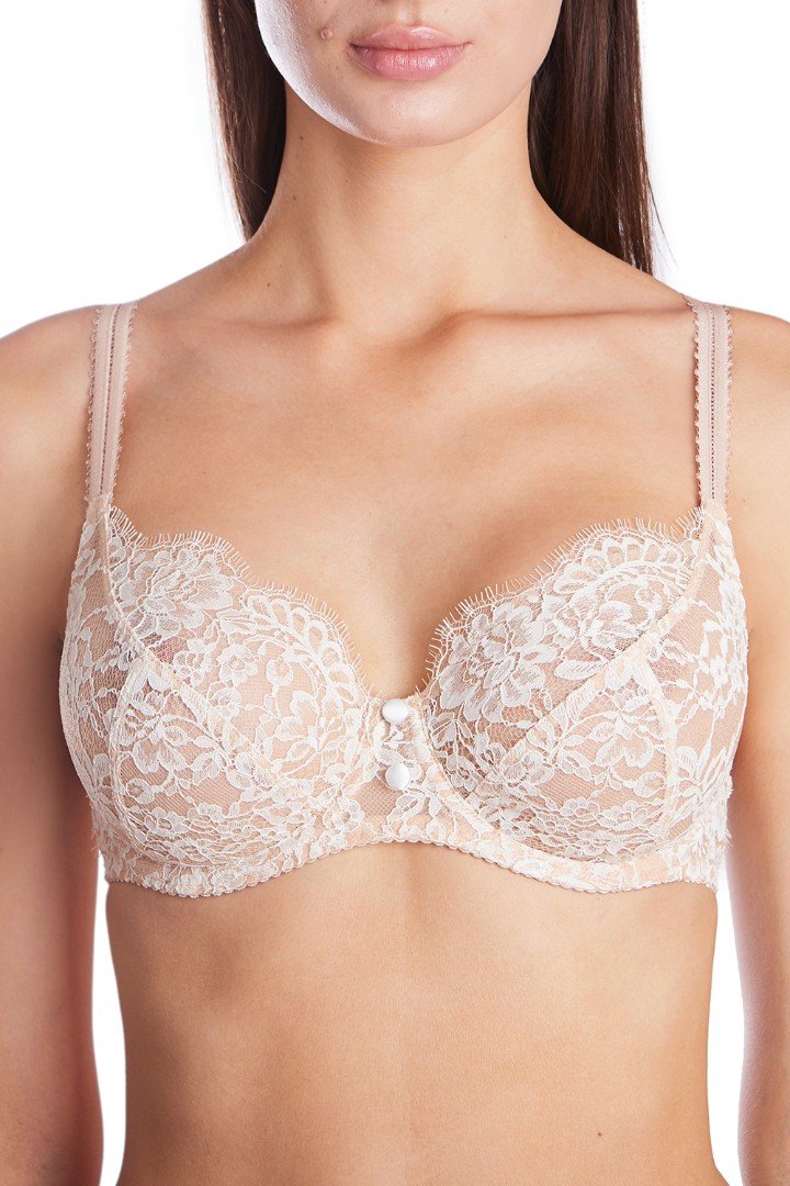 Sutienul cu cupe moi pe carcas conferă sânilor o formă frumoasă și naturală, fără volum suplimentar, și asigură un sprijin fiabil. Modelul este realizat în întregime din dantelă subțire, semitransparentă, cu un model floral delicat, ceea ce îl face incredibil de ușor și confortabil de purtat. Decorul sub formă de nasturi de mătase conferă rafinament ținutei, iar bretelele decorative adaugă o notă de modernitate.