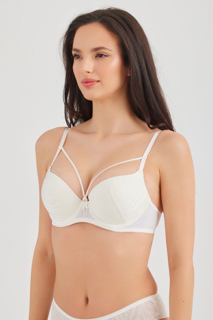 Sutien cu cupe push-up. Fabricat din material imprimat cu pernute de silicon. Strap decorativ detasabil. Curelele sunt detasabile la spate. inchidere cu carligi la spate.