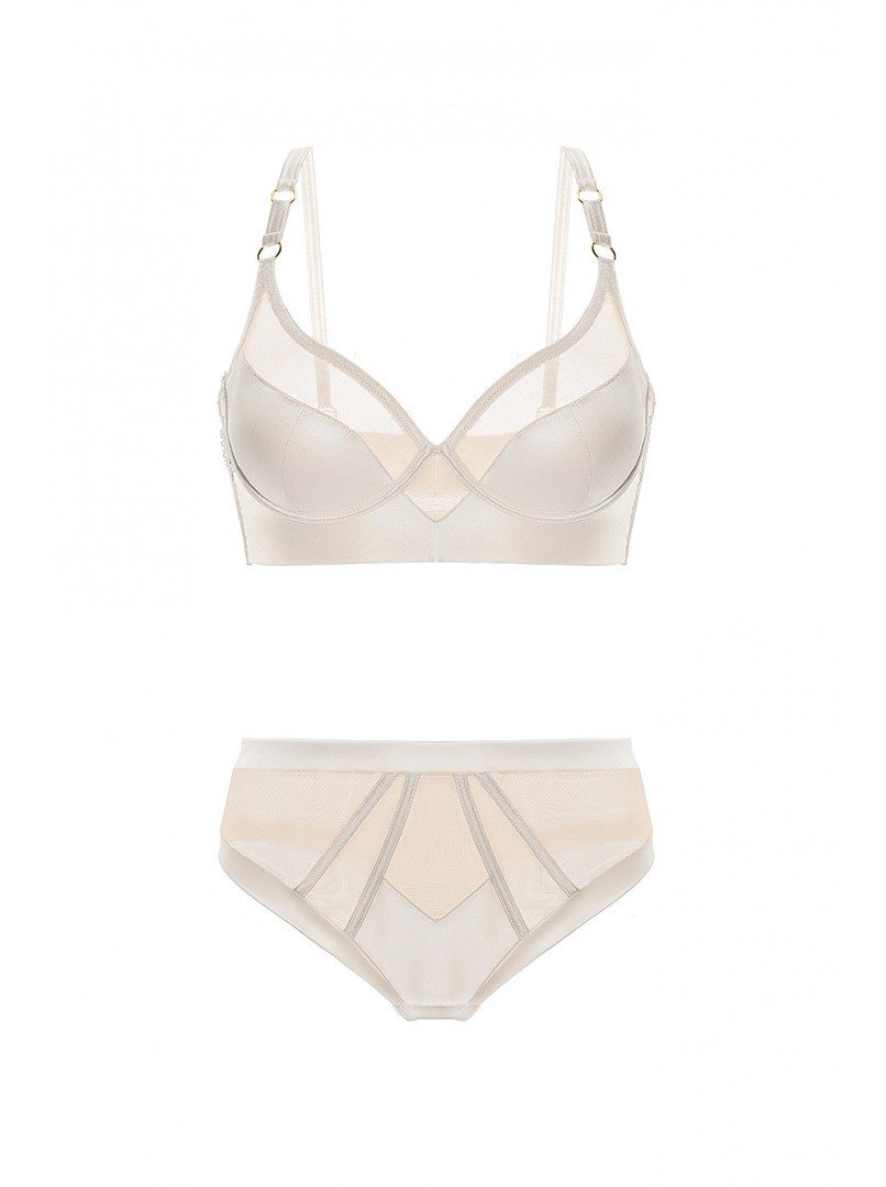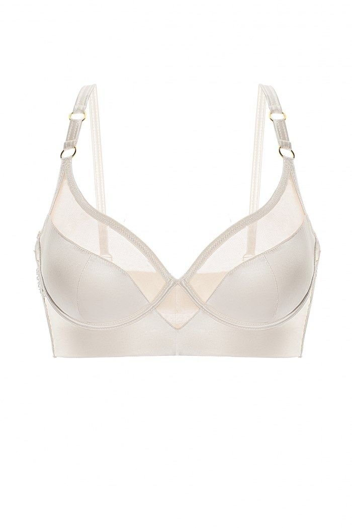 Un bust fermecător cu cupe de semi-buretă pe rame, a cărui parte superioară este realizată din plasă elastică. Materialul neted de pe cupe și talie, combinat cu un tul transparent, arată foarte impresionant pe piept, oferind unei femei un farmec aparte. Bretelele înguste sunt reglabile pe înălțime. Un spate larg, neted, elastic, cu trei elemente de fixare, sutienul este completat cu rame laterale.